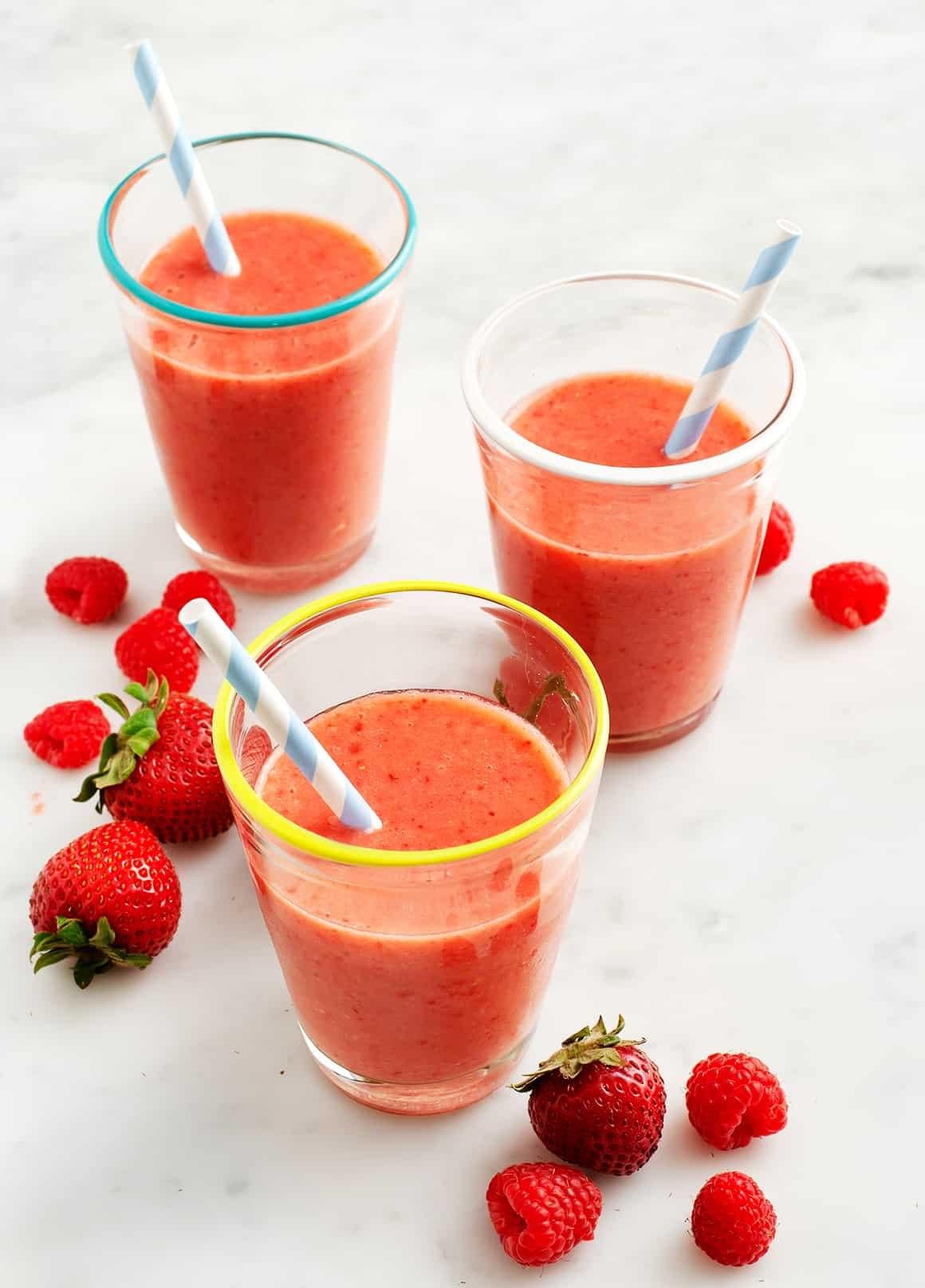 I like to make this smoothie with a mix of strawberries and raspberries, but if you prefer to go fully in the strawberry banana direction, use 2 cups strawberries instead of strawberries and raspberries, and use a full banana instead of a half. This strawberry banana smoothie recipe works with fresh or frozen fruit, just cut back on the ice if you opt for frozen fruit. I encourage you to try adding the optional basil or mint – they add a lovely freshness to this drink.